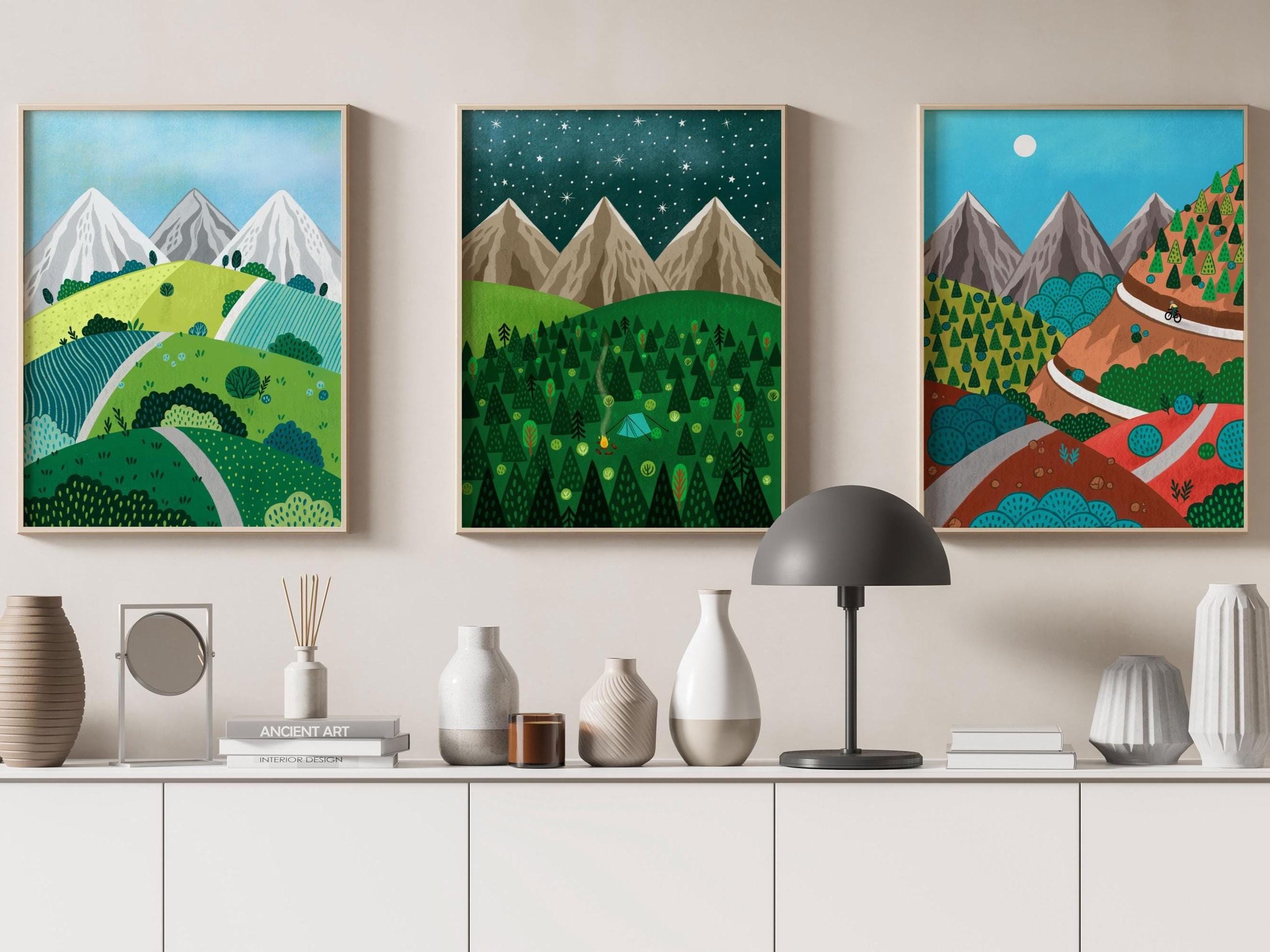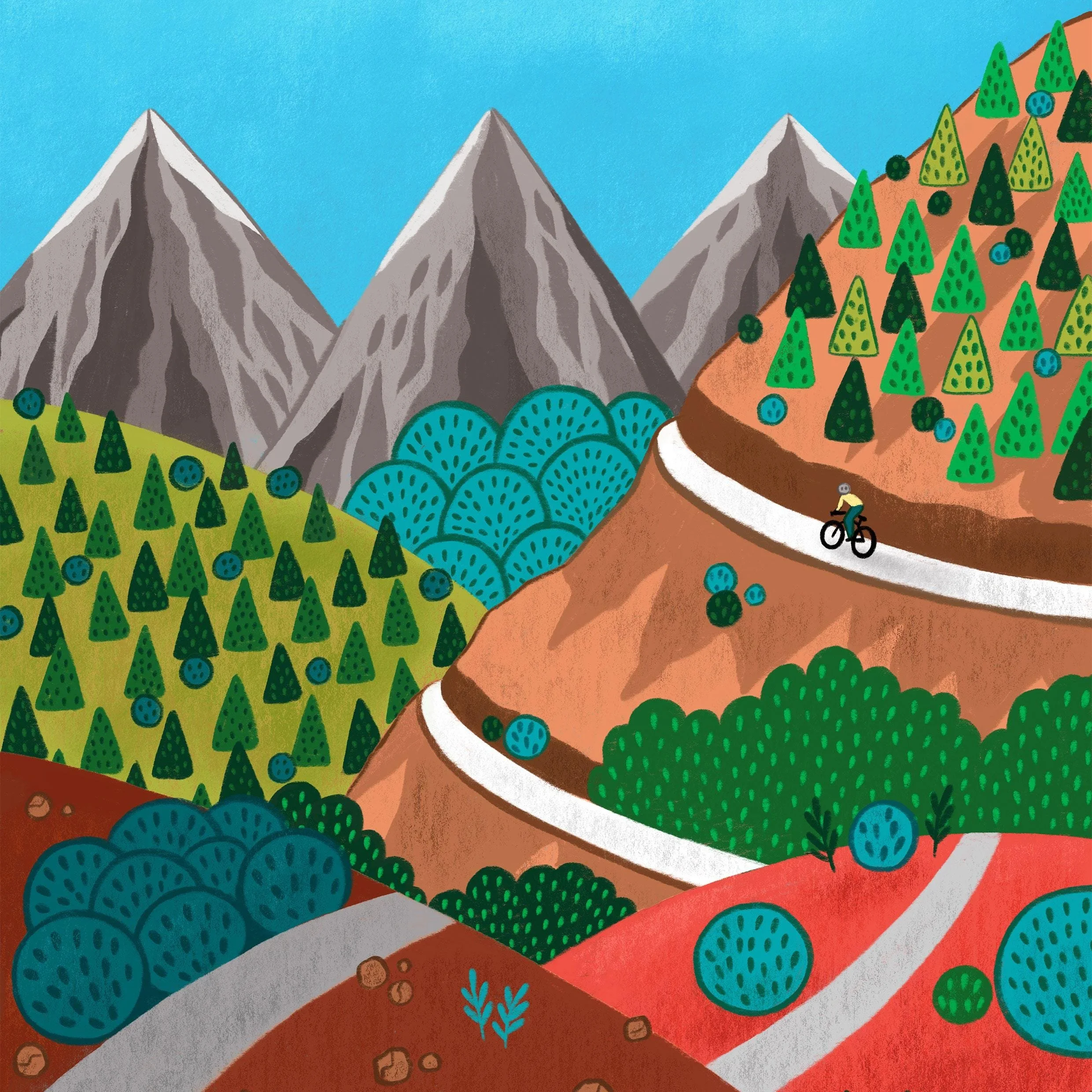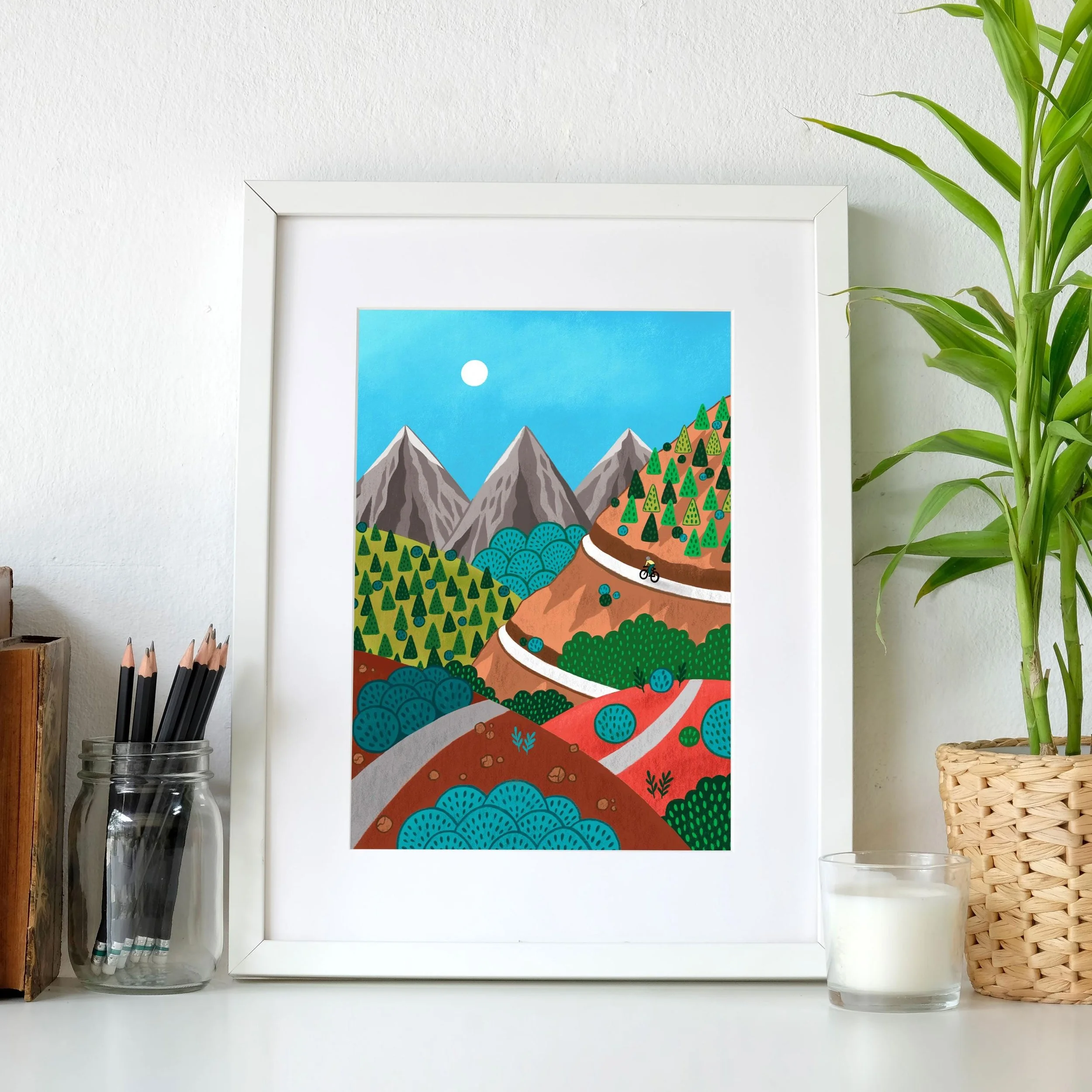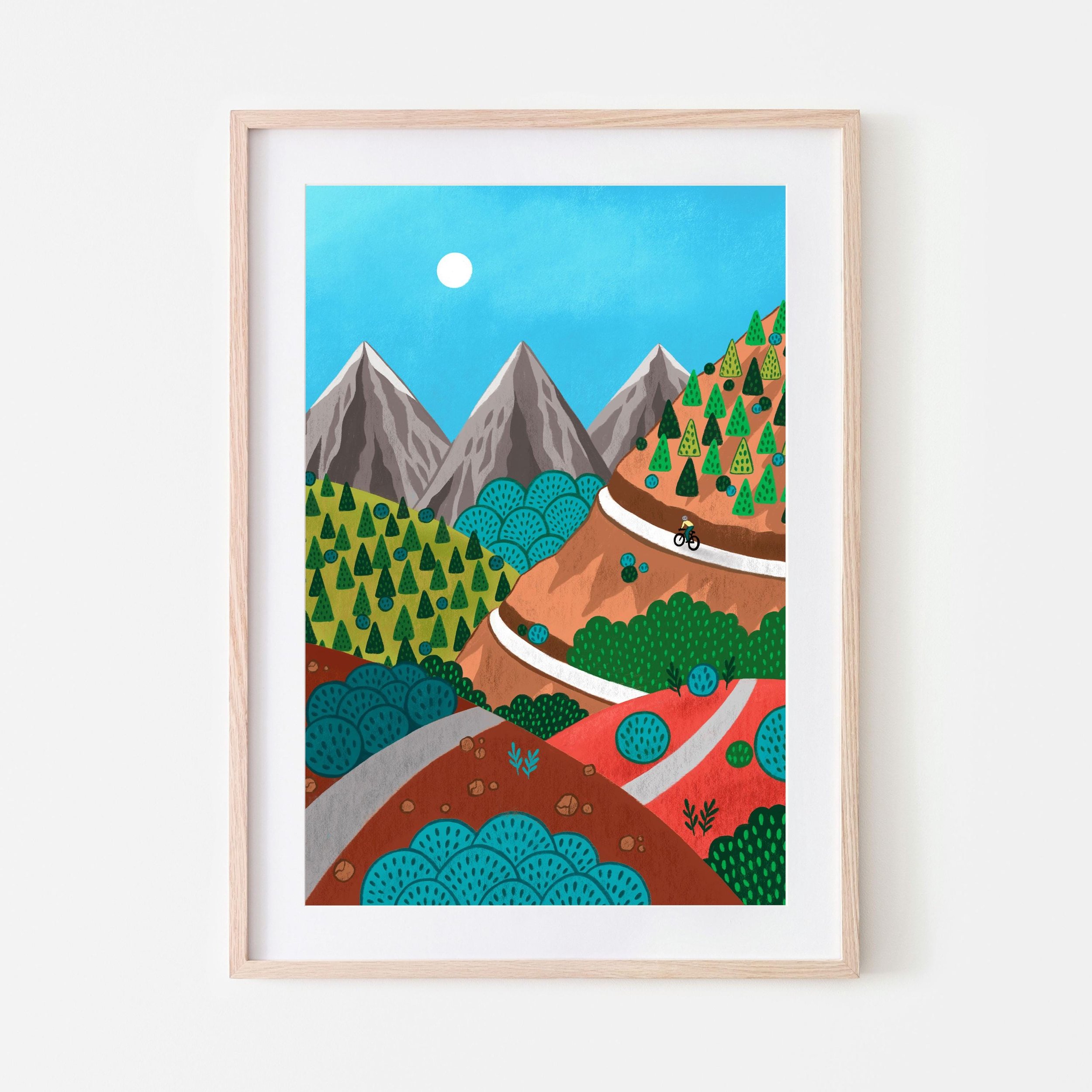Mountain Cycling Art Print, Whimsical Landscape, Geometric Design