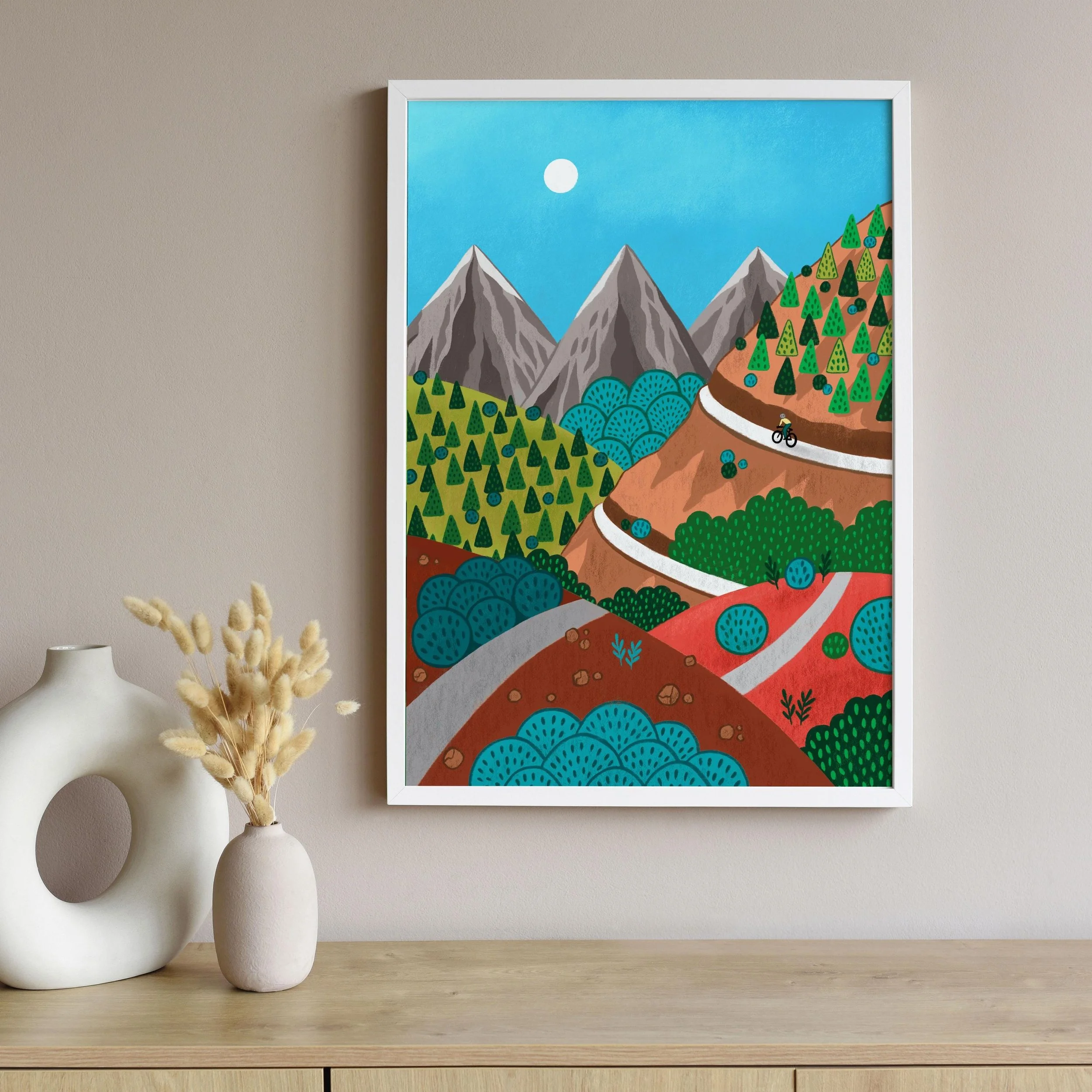 Add a touch of whimsical adventure to your space with this charming art print. Featuring a striking landscape, this piece showcases a lone cyclist navigating a captivating terrain of geometric mountains and richly textured hillsides in shades of green, terracotta, and teal. The bright blue sky and a subtly glowing sun illuminate the scene, making it a lively and engaging focal point. With its distinct illustrative style, this print brings a contemporary yet timeless feel, perfect for elevating any room.