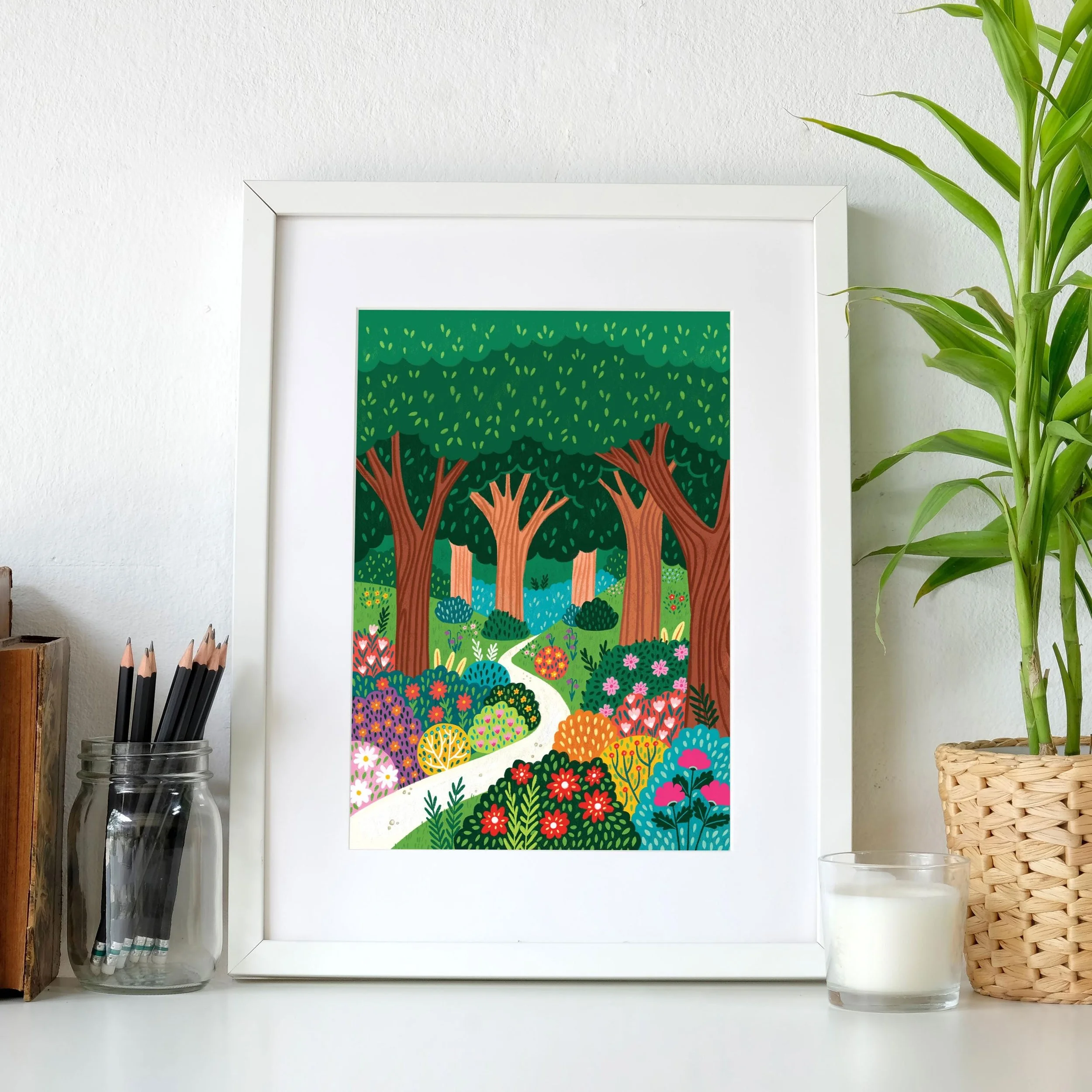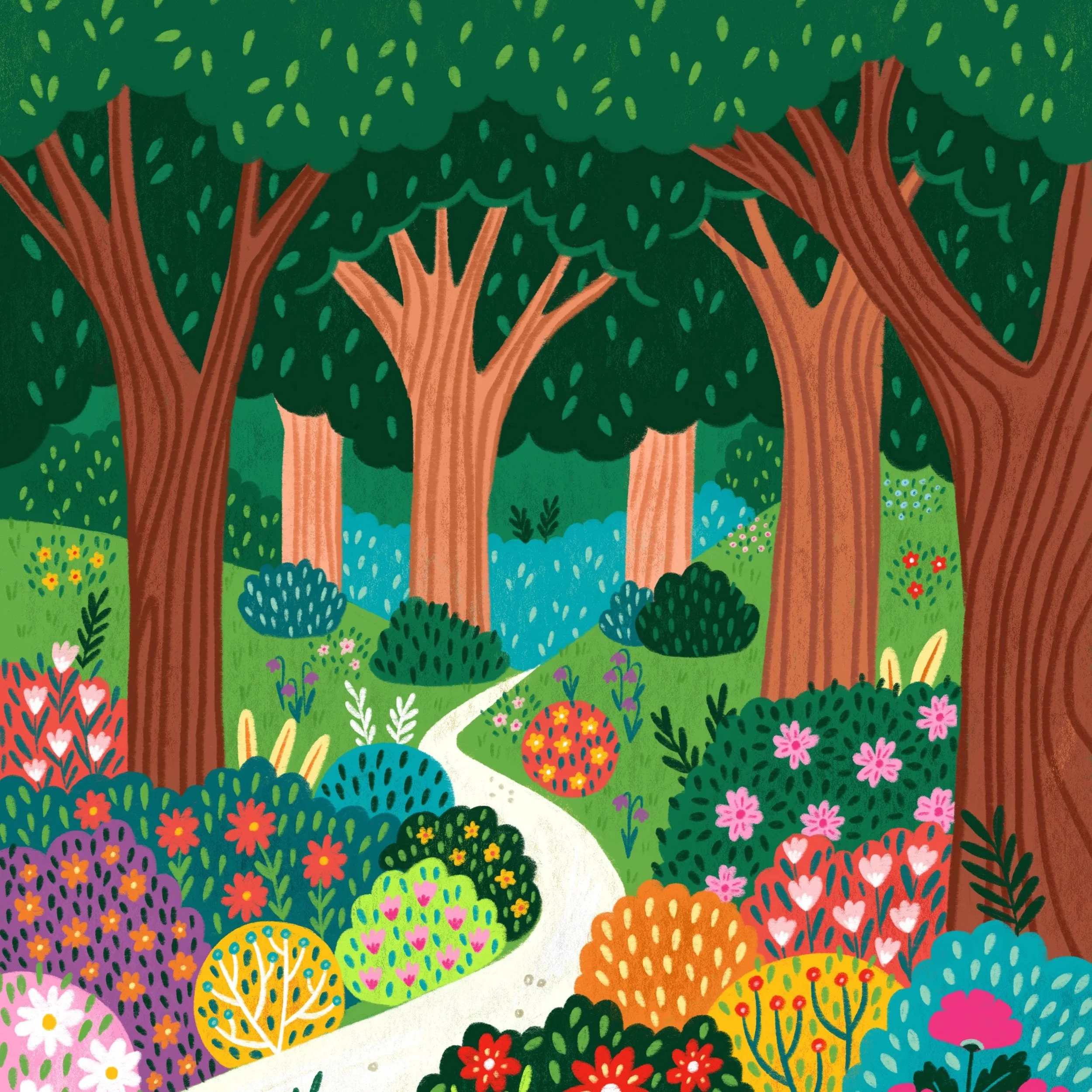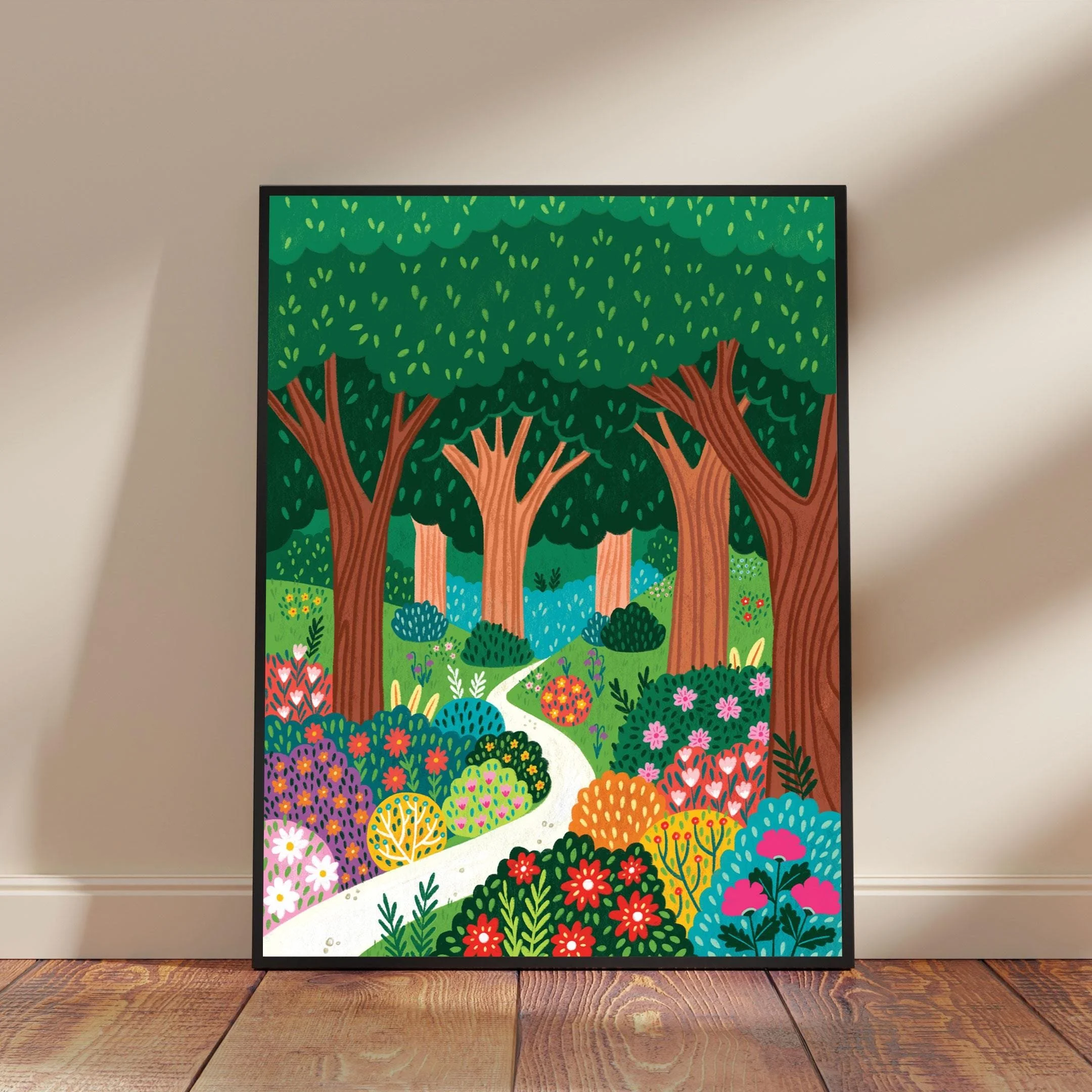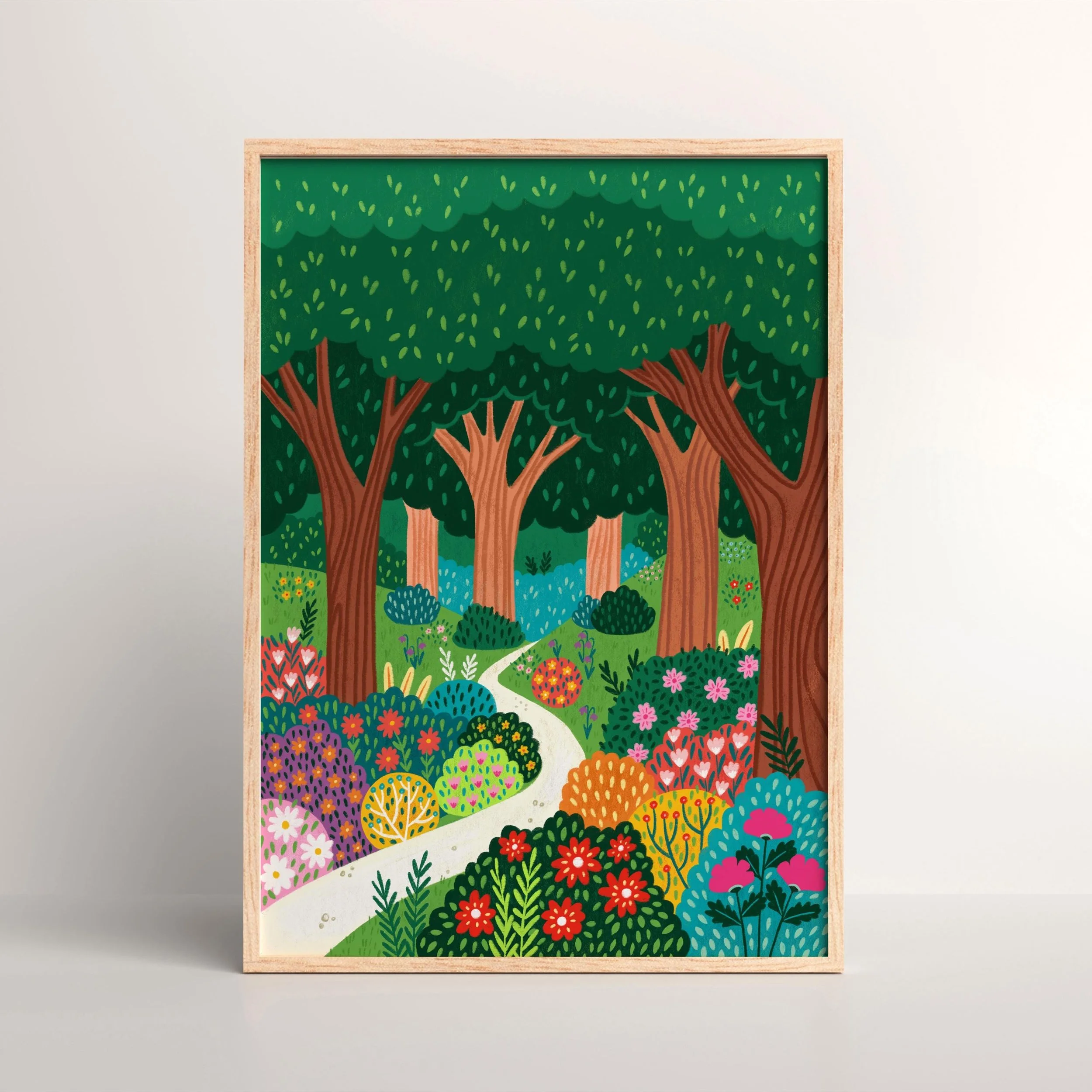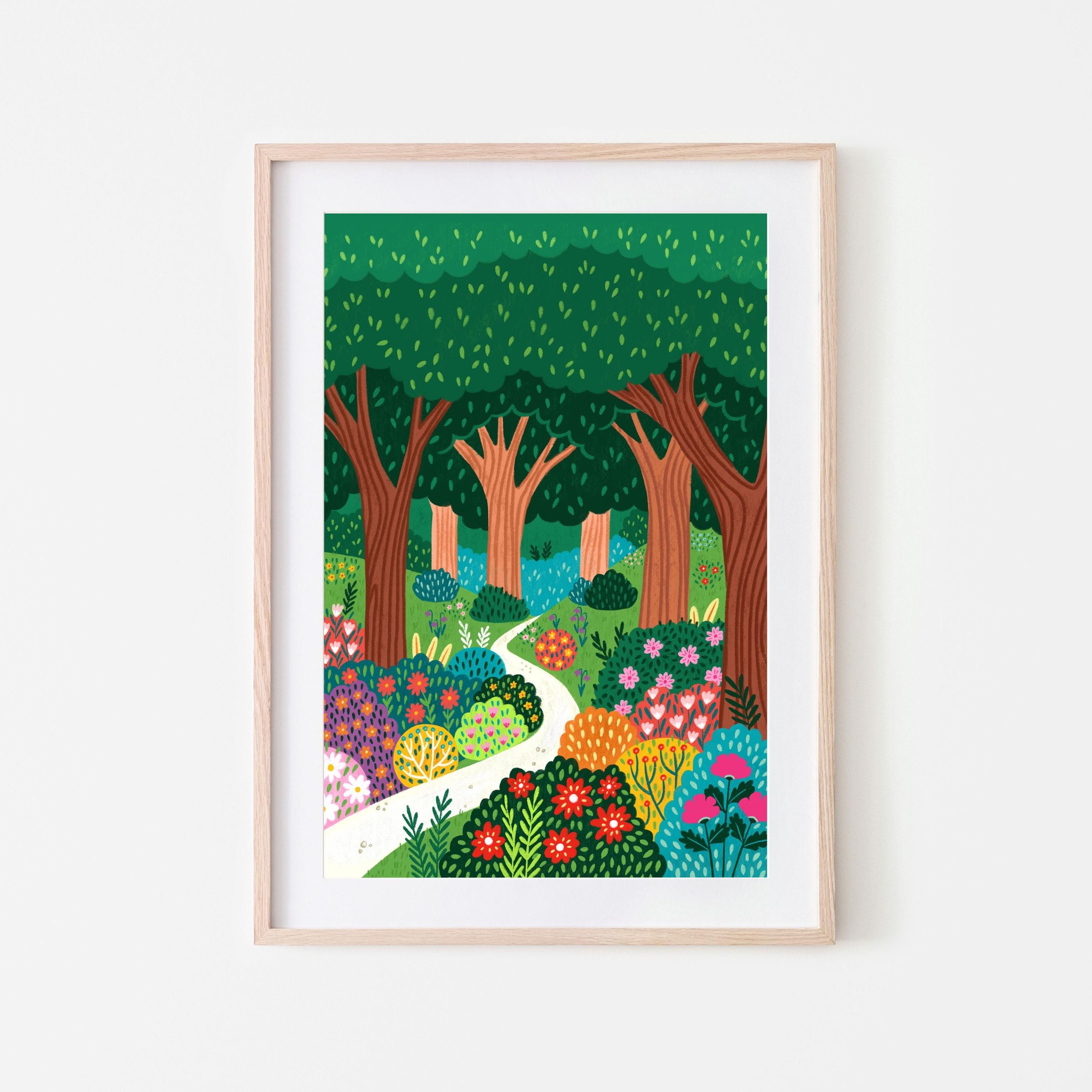 This vibrant art print invites you into a fantastical forest scene, bursting with colour and charm. A bright, winding path meanders through a lush landscape, drawing the eye deeper into the woods. The foreground is alive with an abundance of stylised flowers and bushes in a dazzling array of hues – reds, pinks, yellows, purples, and various greens – all hand drawn with playful patterns and textures.