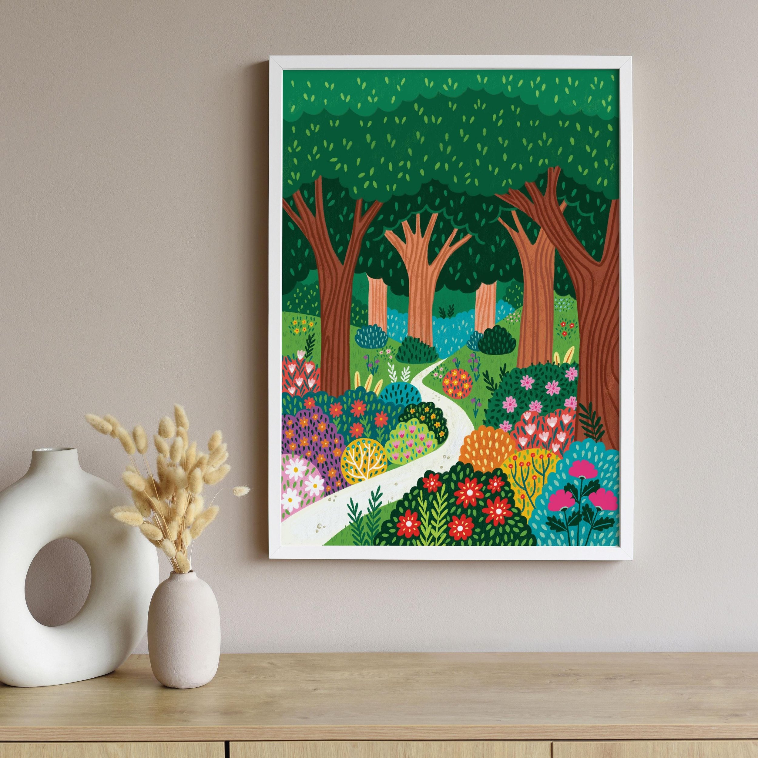 Whimsical Forest Art Print, Colourful Floral Woods Illustration