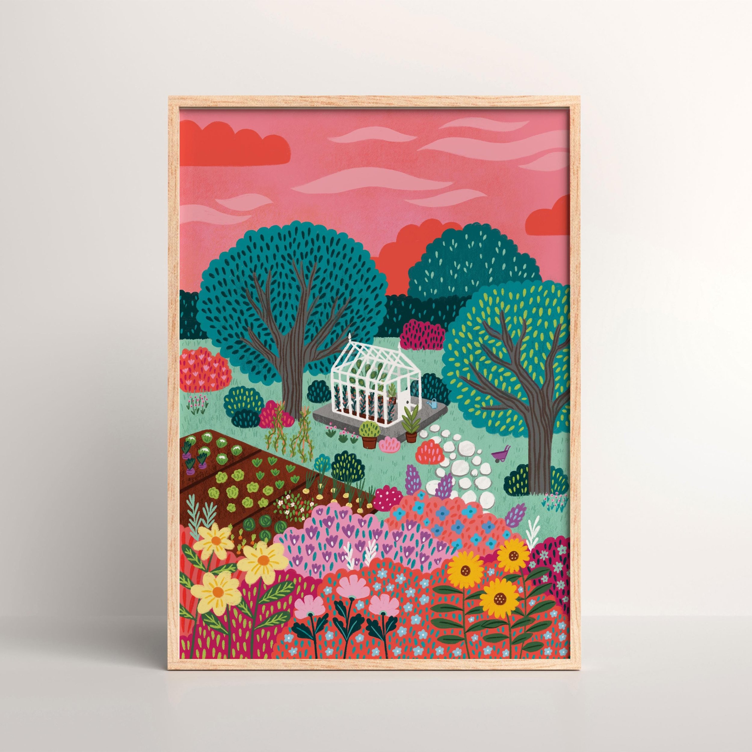 This delightful art print captures the essence of a vibrant, flourishing garden under a warm sky. A whimsical white greenhouse stands as the charming focal point, surrounded by a lively array of colourful flora. The foreground bursts with stylised flowers in shades of yellow, pink, blue, and red, arranged in playful clusters and neat rows, suggesting a well-tended yet joyful space.